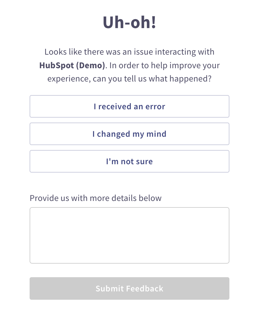 In certain cases, especially with OAuth2 flows, Kolla can’t detect what happened when there was an error. As an example, if you are using the HubSpot connector and something is configured wrong, HubSpot doesn’t return that error back to the software trying to connect. So what do you do if you can’t detect an error automatically? If we see a user tried to create a link but never finished and then closed the OAuth popup window, we simply ask the user what happened!
